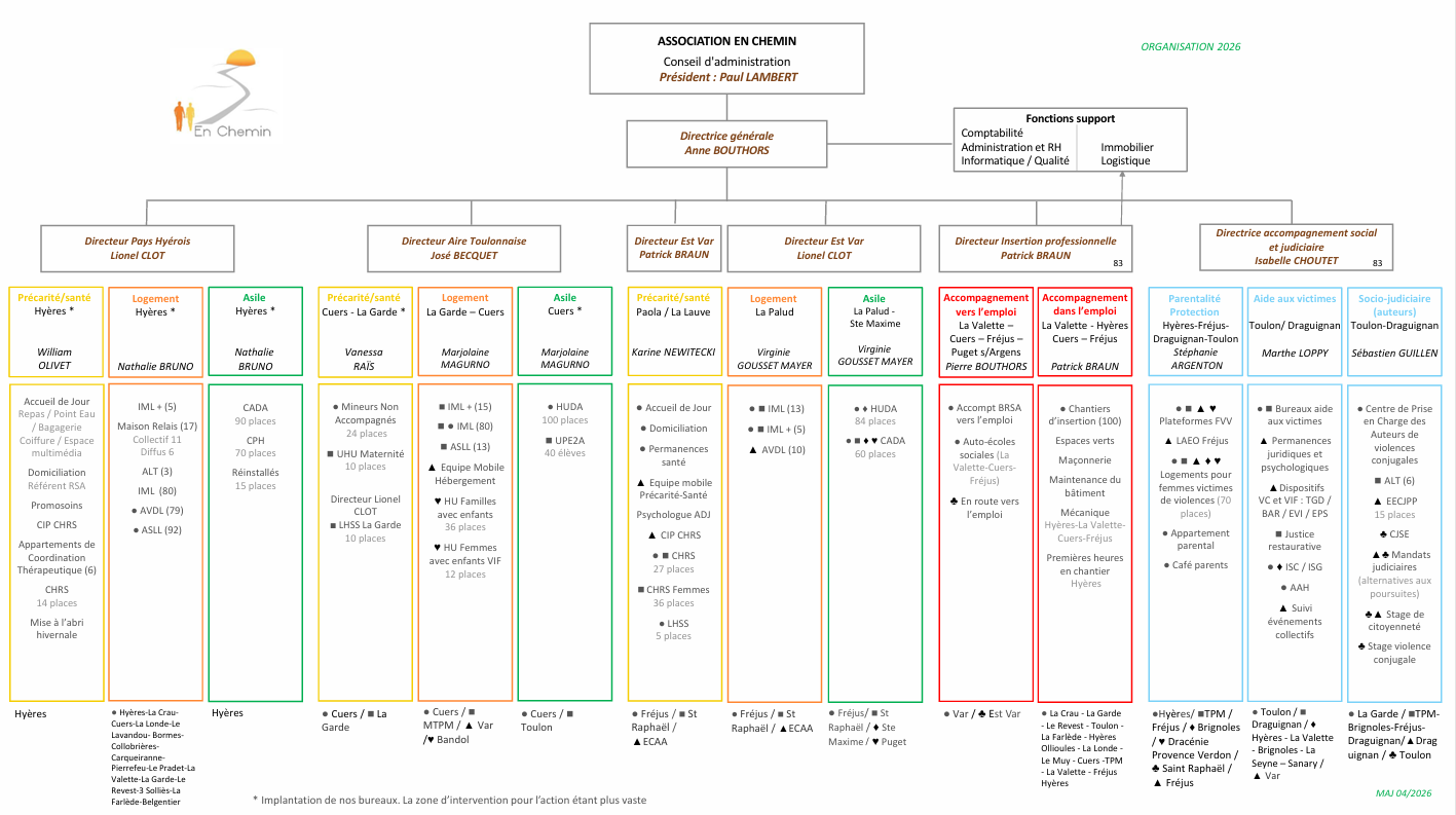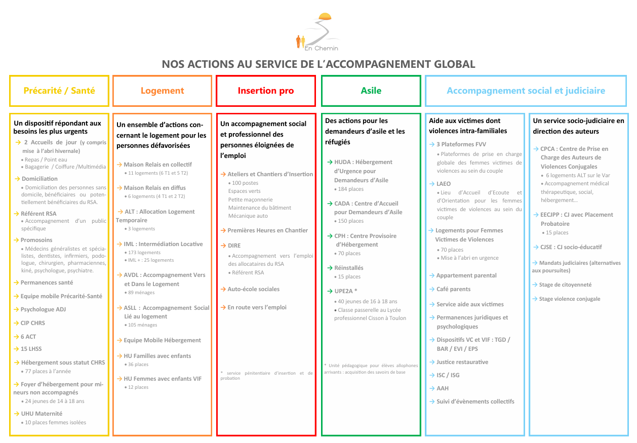 Fondée en 2008, l’association En Chemin a comme objectif, sur le département du Var, l’accompagnement global et individualisé des personnes en difficulté vers l’insertion sociale, le retour à l’autonomie et l’activité.